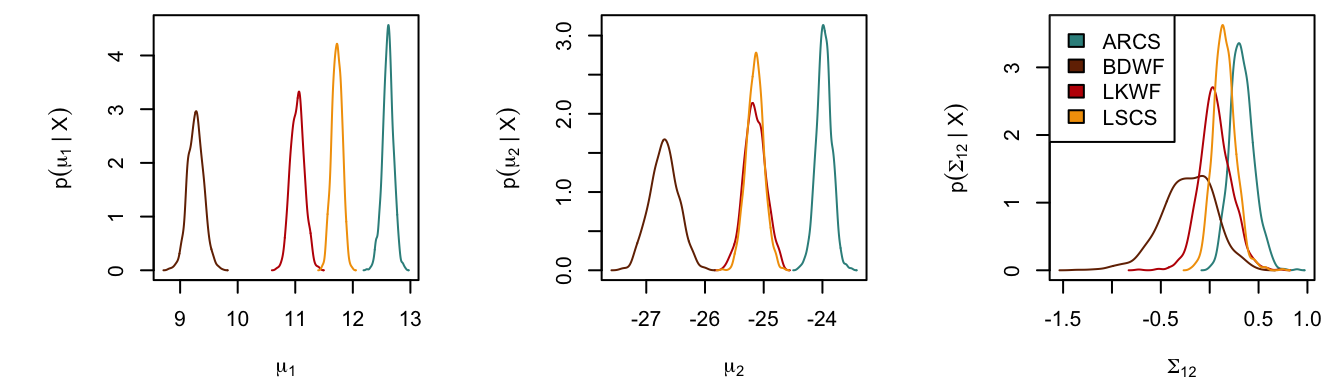 function(ii) niw.post(nsamples = nsamples, X = fish[ii,2:4]))niw.post() uses a data matrix (X) as observation data, calculate the posterior distribution, and then draws a set of means and covariance matrices of a possible multivariate distribution, which includes the prior and our observation data. The main idea is that because analytically working with posterior multivariate distribution is too impractical, so we employ the :Monte Carlo approach to have a view of the posterior. We use tapply() to separately apply 1000 times of niw.post() on each fish species.