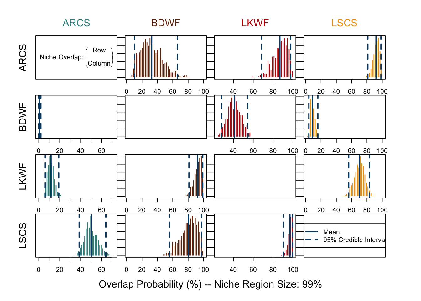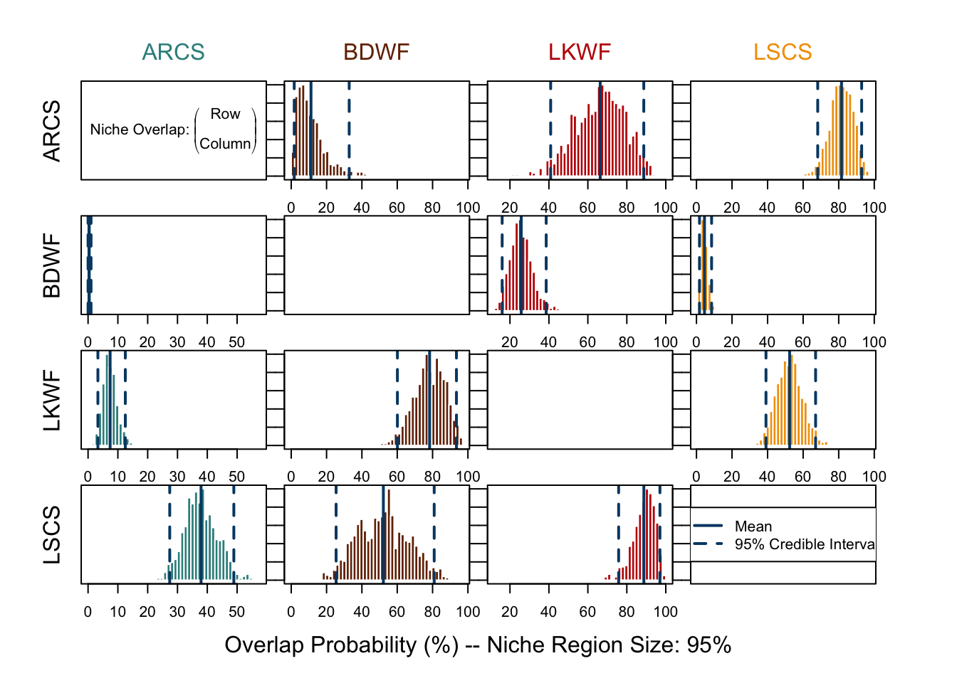 overlap.plot(over.stat95, col = clrs, mean.cred.col = "#024873", equal.axis = TRUE, xlab = "Overlap Probability (%) -- Niche Region Size: 95%")# 99% niche region