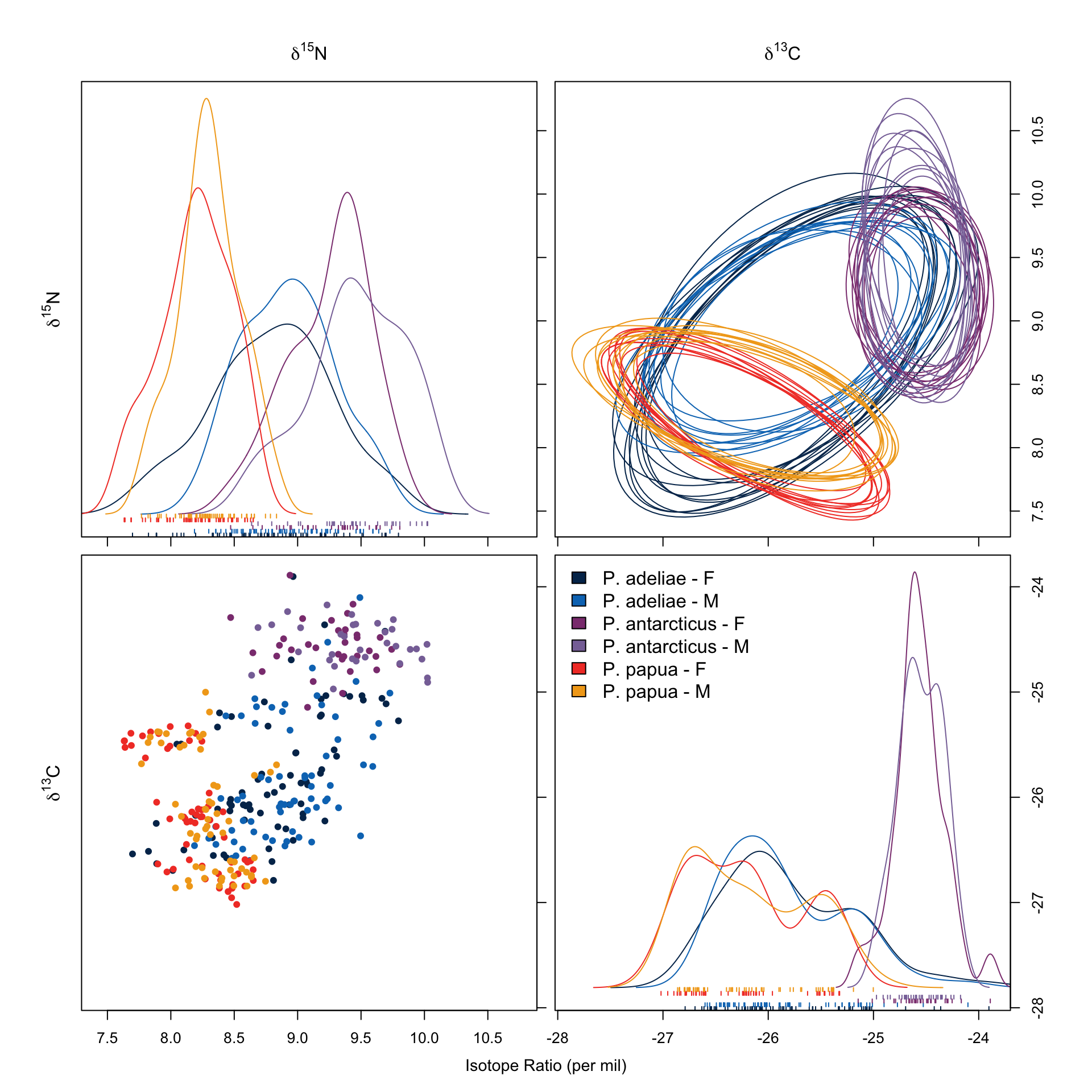 Let’s run the niche overlap analysis on another dataset. There’s a datasets of 3 Pygoscelis species nesting along the Palmer Archipelago near Palmer Station, containing structural measurements, two isotope ratios, and basic metadata. Isotope data was collected from blood samples, and additional records of whether the sampled individuals have completed their clutch were documented.