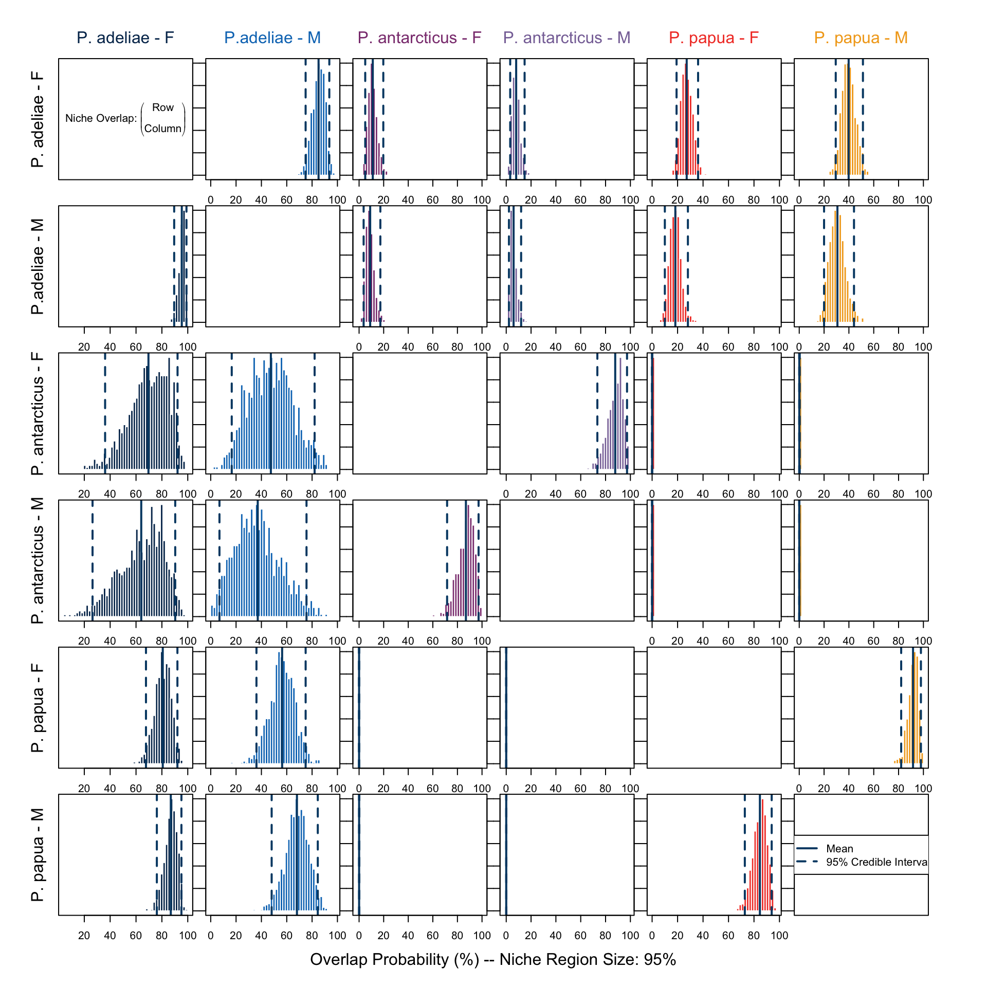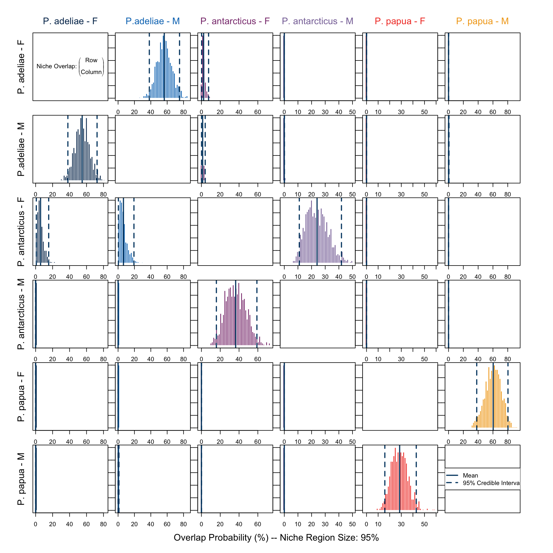 overlap.plot(over.stat95, col = clrs, mean.cred.col = "#024873", equal.axis = TRUE, xlab = "Overlap Probability (%) -- Niche Region Size: 95%", species.names = c("P. adeliae - F", "P.adeliae - M", "P. antarcticus - F", "P. antarcticus - M", "P. papua - F", "P. papua - M"))In Figure 7 we saw no remarkable differences between sexes within each species. We also noticed that P. adeliae has the largest niche region and it overlaps with both the others. This is also shown in Figure 8.